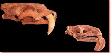 Böyük dişlərə sahib olan və bir-biri ilə heç bir əlaqəsi olmayan iki məməli. Plasentalı və kisəli məməlilər arasındakı fövqəladə oxşar “ekiz”lərə başqa bir nümunə: yırtıcı məməli Smibdon (sağda) və Thylacosmilusdur (solda). Hər ikisi böyük qabaq dişlərə sahib olan və heç bir təkamülçü əlaqənin qurulması mümkün olmayan bu canlıların kəllə sümükləri və diş quruluşlarının oxşar olması bənzər quruluşlara sahib olan canlıların təkamülə sübut olaraq təqdim olunan hemologiya anlayışını cıxılmaz vəziyyətə salır. |
