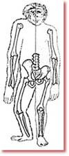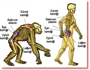 ![]() İnsan skeleti dik yeriməyə uyğun olaraq yaradılmışdır. Meymun skeleti isə önə əyilmiş quruluşu, qısa ayaqları və uzun qolları ilə dörd ayaqlı hərəkət şəklinə uyğundur. Bu iki quruluş arasında bir keçid formasının əmələ gəlməsi isə bu keçid formasının əlverişsizliyinə görə mümkün deyildir. |