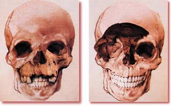 ![]() Atapuerka dağında tapılan fosildən istifadə edilərək bərpa edilən kəllə sümüyü (solda) ilə dövrümüzdəki insana aid kəllə sümüyü (sağda) son dərəcə oxşardır. |