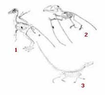 1- Bilinən ən qədim quş, Archaeopteruux 2- Bilinən ən qədim uçan sürünənlərdən biri olan və bu qrupun səciyəvi nümayədəsi sayılan Dimorphodon 3- Bir cox təkamülçü mənbə tərəfindən Quşların və uçan sürünənlərin atası sayılan quru sürünəni Euparkeria Bilinən ən qədim quş ( Archaeopteryx), bir uçan sürünən və təkamülçülərə görə bu canlıların ən yaxın qohumu sayılan quru sürünəni. Canlılar arasında fərq yenə cox böyükdür. |
