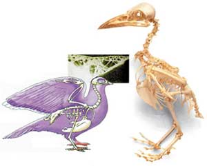 Quşların skletlərini təşkil edən sümüklərin içi dinozavrların və sürünənlərin sümüklərinin əksinə boşdur. Bu boşluq skletə sağlamlıq və yüngüllük verir. Quşların skelet quruluşlarının eynisi, günümüzdə təyyarələrdə, körpüləridə və bəzi qurğularda istifadə edilməkdədir. Dinozavrların sümükləri, böyük və sağlam olduqları üçün qalındır və içi doludur. Amma yaşayan və nəsli kəsilmiş bütün quşların sümüklərinin içi boşdur və bunun sayəsində yüngüldür. |