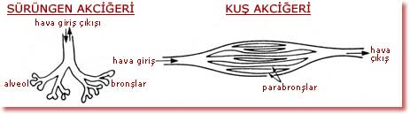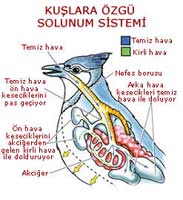 Quşun ağciyərləri quruda yaşayan canlıların ağciyərlərinin əksinə çalışır. Quruda yaşayan canlılar havanı eyni borudan alıb verirlər. Quşlarda isə, hava ağciyərdə dayanmadan bir istiqamətli hərəkət edir. Bu ağciyərlərin ətrafında olan xüsusi “hava kisəcikləri” tərəfindən təmin edilir. Təfsilatı sonrakı səhifədə görsənən bu sistem sayəsində quşlar bizim kimi fasilələrlə deyil, davamlı olaraq nəfəs alırlar. Uçuş zamanı yüksək miqdarda oksigenə ehtiyac hiss edən quşlar üçün bu cür xüsusi quruluş yaradılmışdır. Bu quruluşun sürünənlərin ağciyərindən təkamül keçirərək meydana çıxması imkansızdır, çünki iki fərqli ağciyər quruluşu arasındakı “ara” bir quruluşla nəfəs almaq olmaz. |